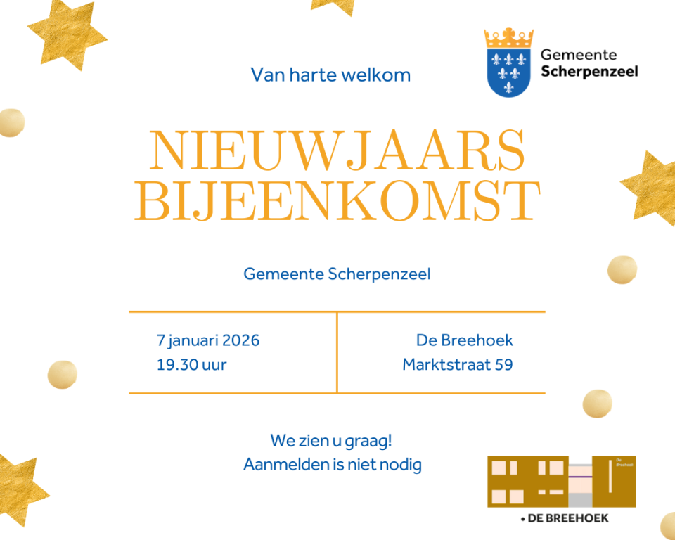 Op woensdag 7 januari om 19.30 uur organiseert de gemeente Scherpenzeel de jaarlijkse Nieuwjaarsbijeenkomst in Breehoek. Iedereen is van harte welkom om samen het nieuwe jaar te verwelkomen, elkaar te ontmoeten en terug te blikken op het afgelopen jaar. We hopen u daar te zien!