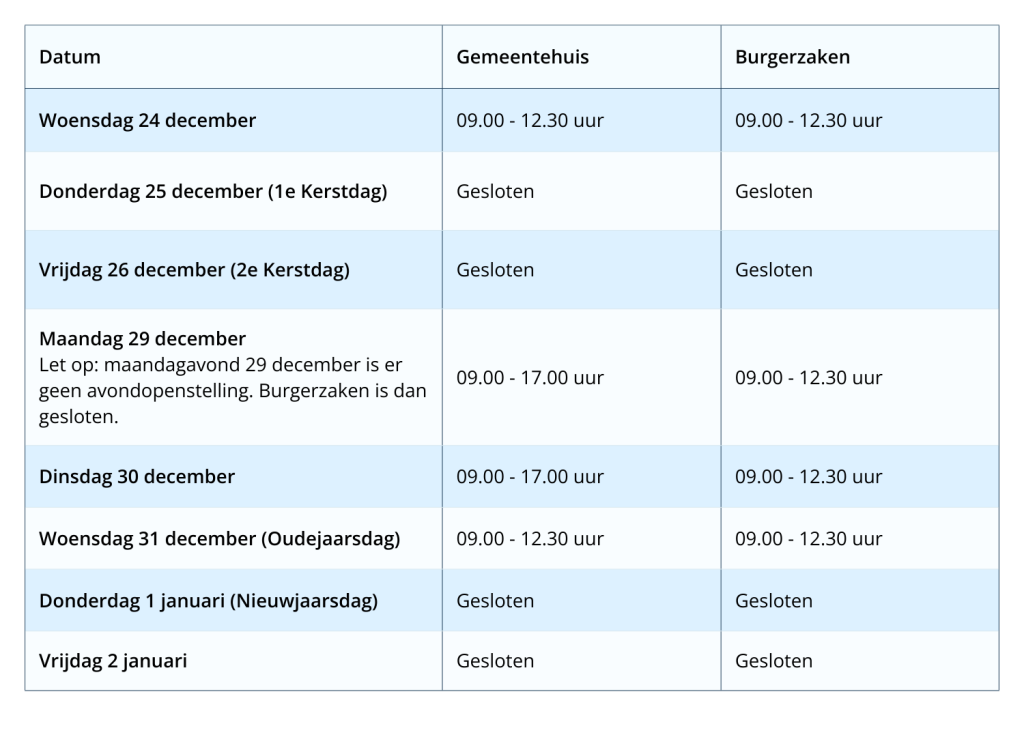 Openingstijden gemeentehuis en burgerzaken rondom de feestdagenDit is een oud bericht.16-12-2025, 15:10Tijdens de feestdagen gelden aangepaste openingstijden voor het gemeentehuis en Burgerzaken. Bekijk hier wanneer wij geopend zijn.