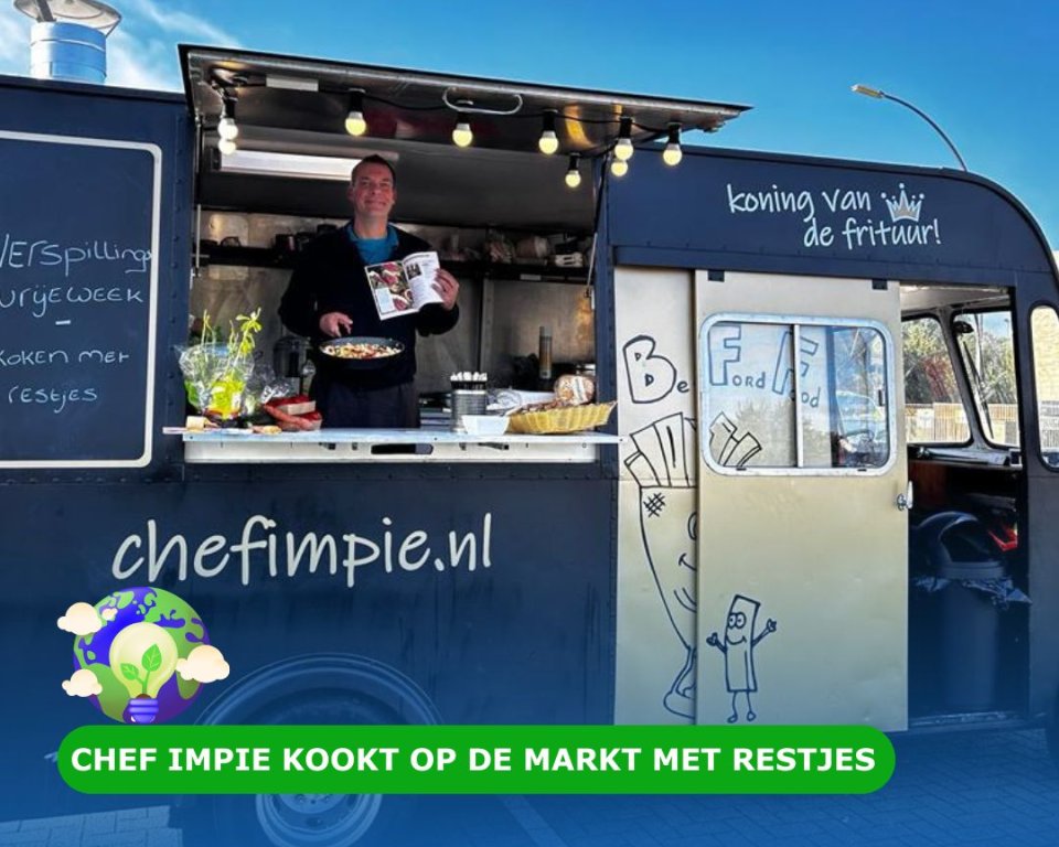 Van 9 t/m 15 september is de Verspillingsvrije week. Daarom staan de foodtruck van Chef Impie, de KlimaatKeet én de Energiecaravan met energiecoach Teun van Roekel op de markt.
